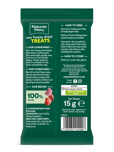 Raw, freeze-dried treats made with 100% lamb. Freeze-drying removes almost all water while locking in nutrients and flavour. Protein-rich. Great as training treats.