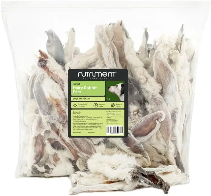 Nutriment Hairy Rabbit Ears are a fantastic chew alternative to pigs and cows ears, especially for our smaller dogs! The addition of the fur is a good source of fibre and helps reduce parasites from the gut naturally!